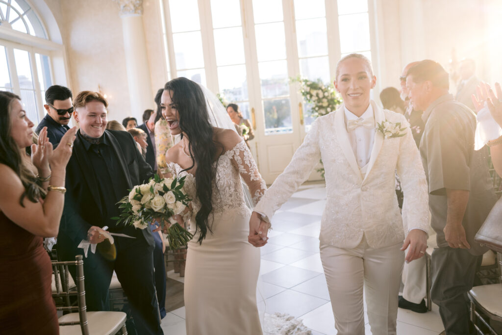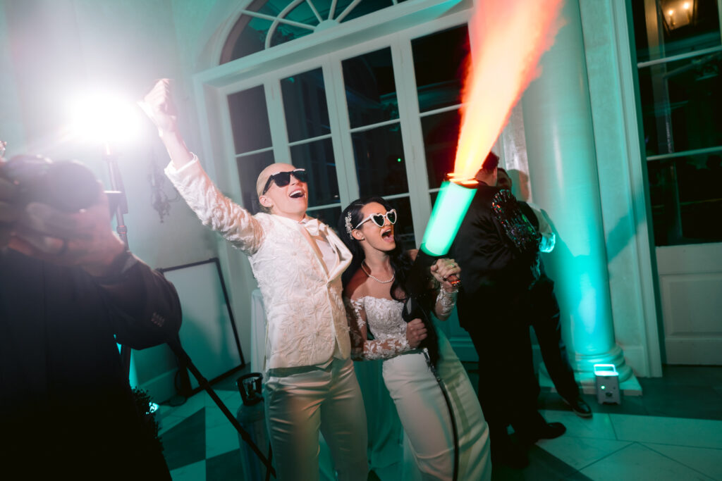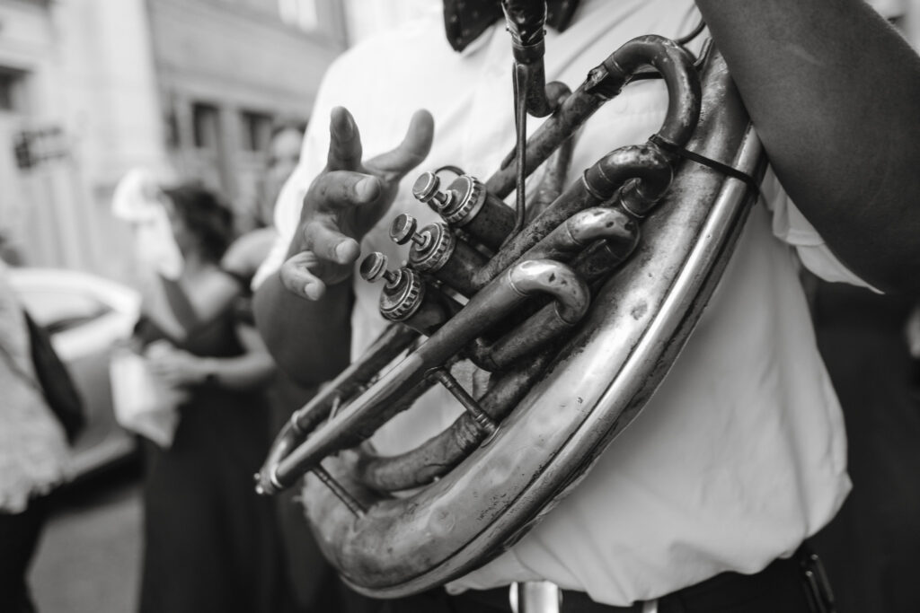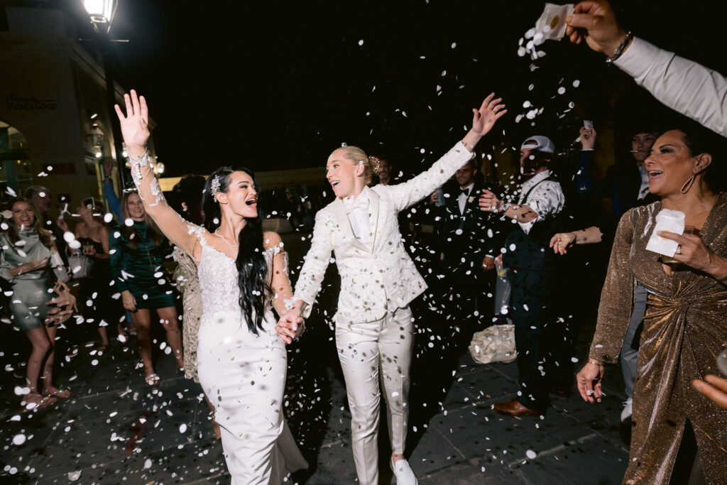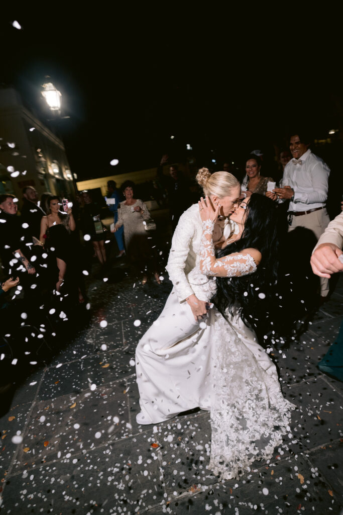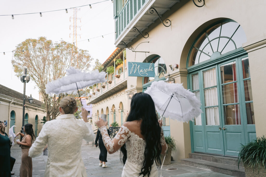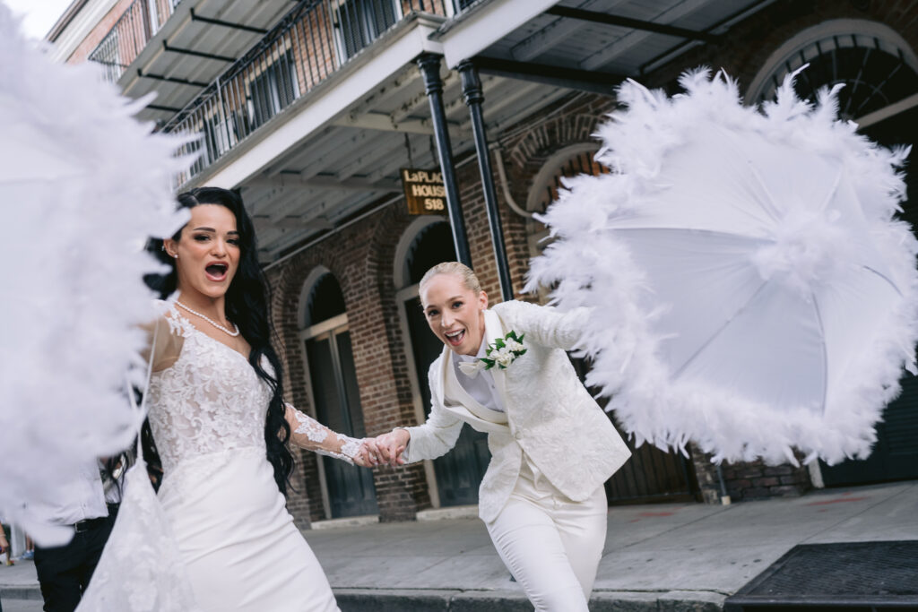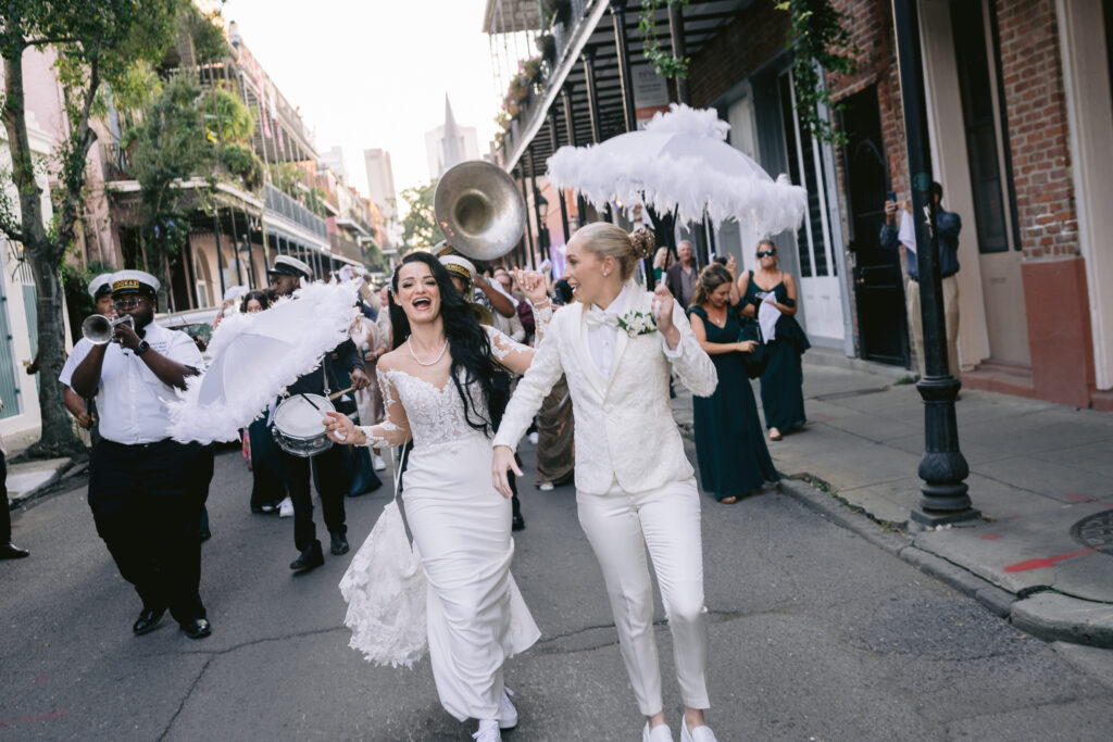 After saying “I do,” Amanda and Victoria enjoyed a traditional New Orleans second line parade through the streets. The city was buzzing that weekend—it was Taylor Swift weekend—so the streets were packed with joyful people, many of whom joined in and danced with the wedding party, adding even more energy to the celebration.